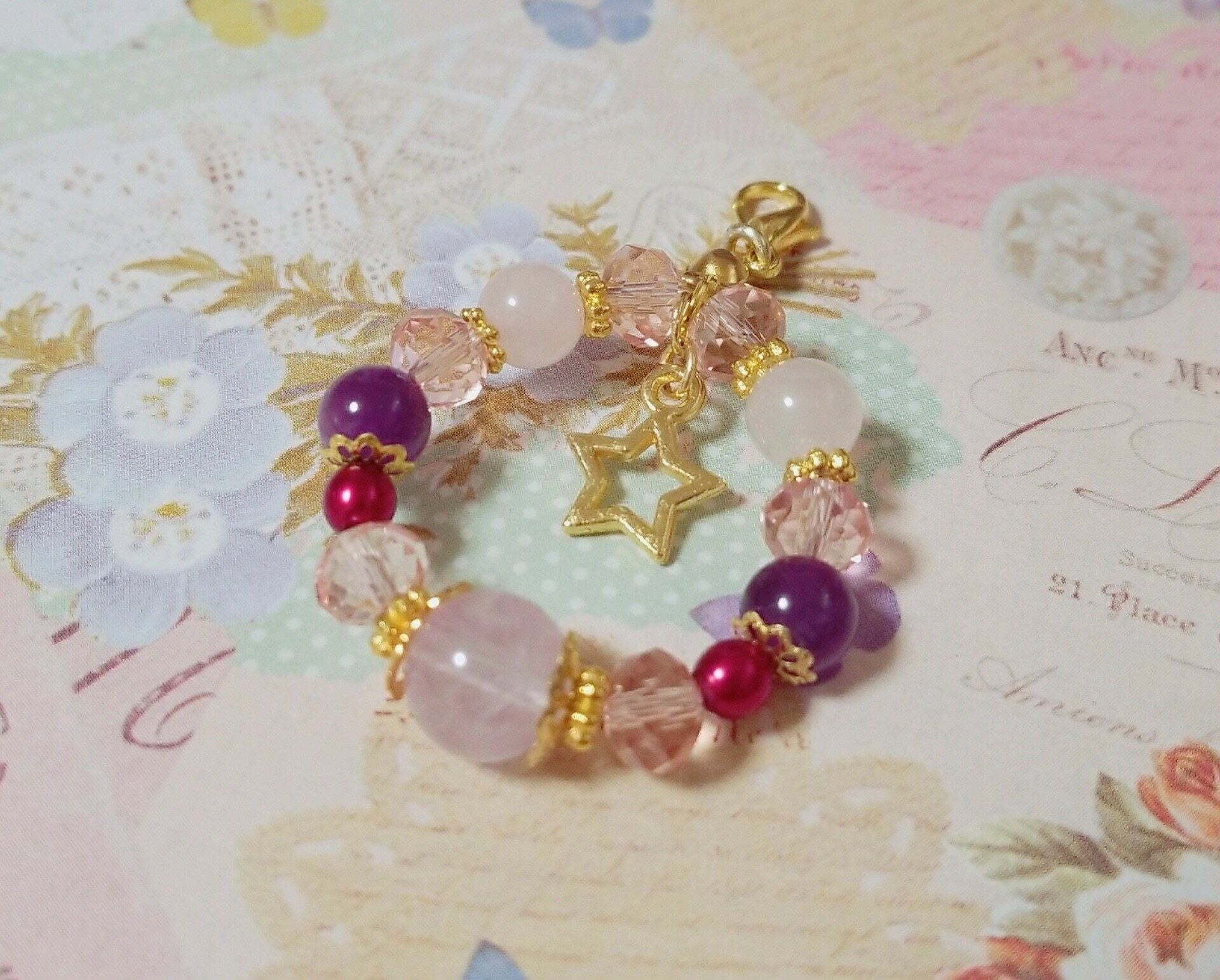 石はローズクォーツ、ラベンダーアメジスト、アメジスト、パール、ガラスビーズを使用してます。